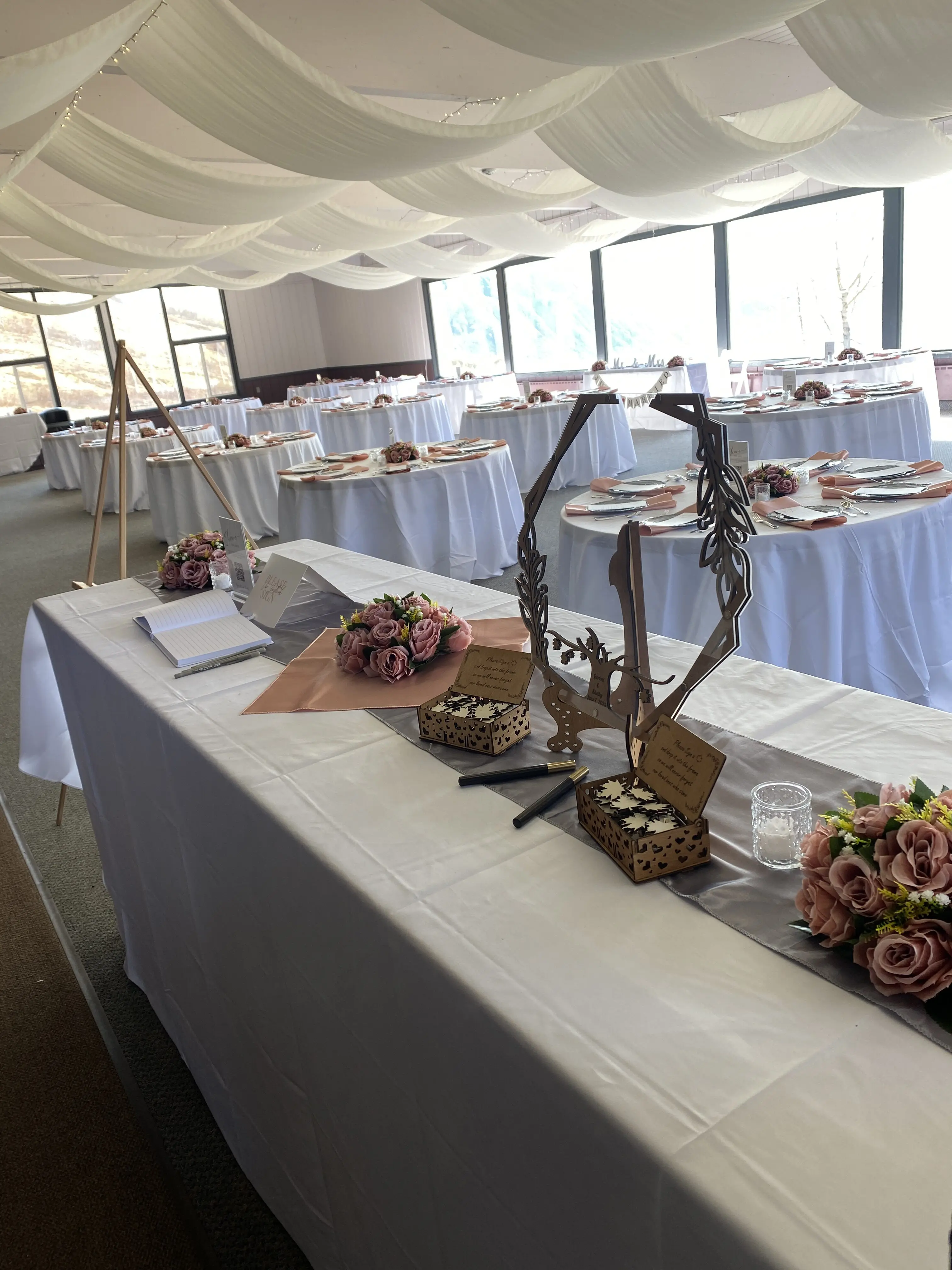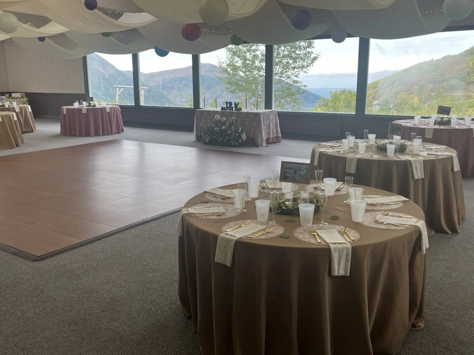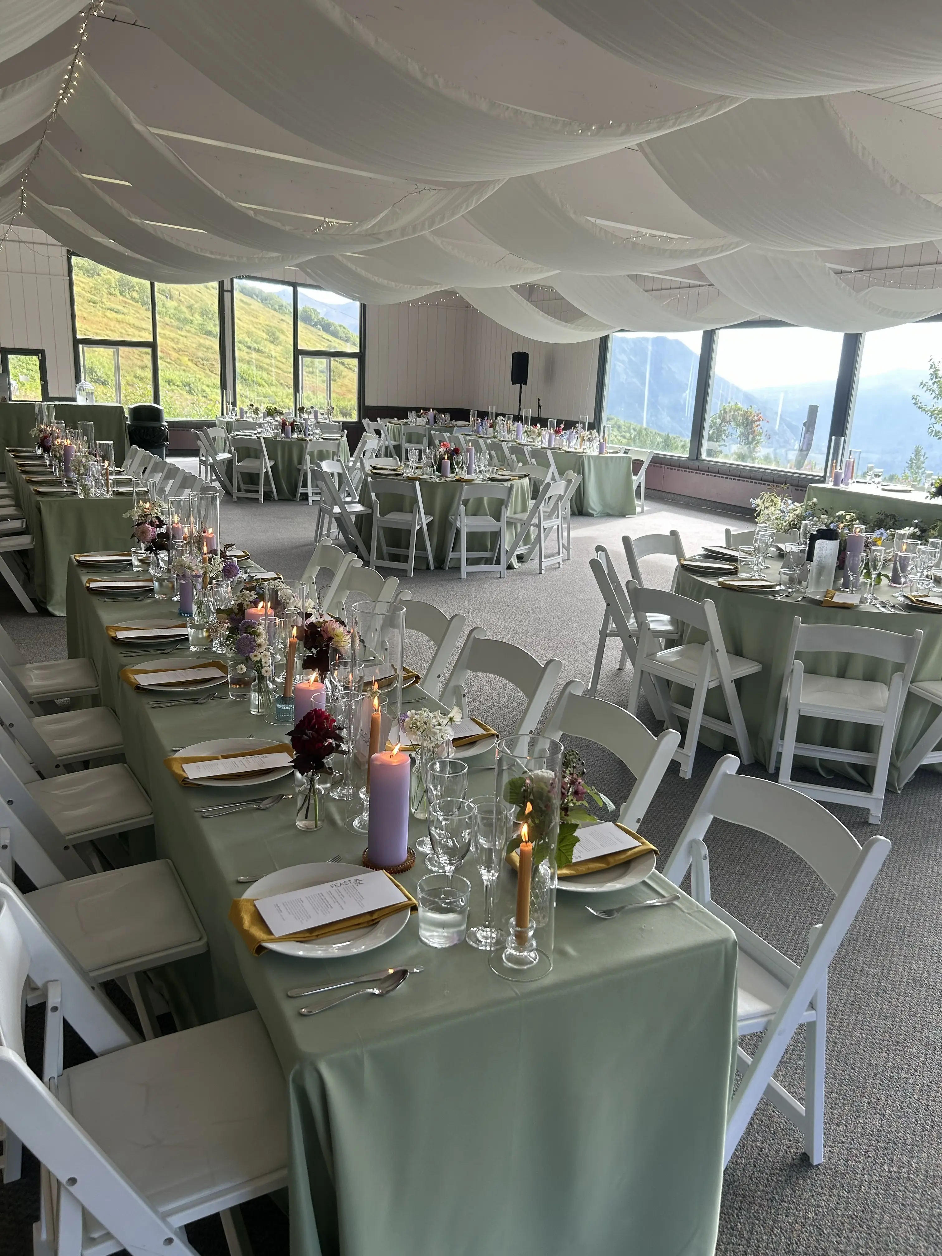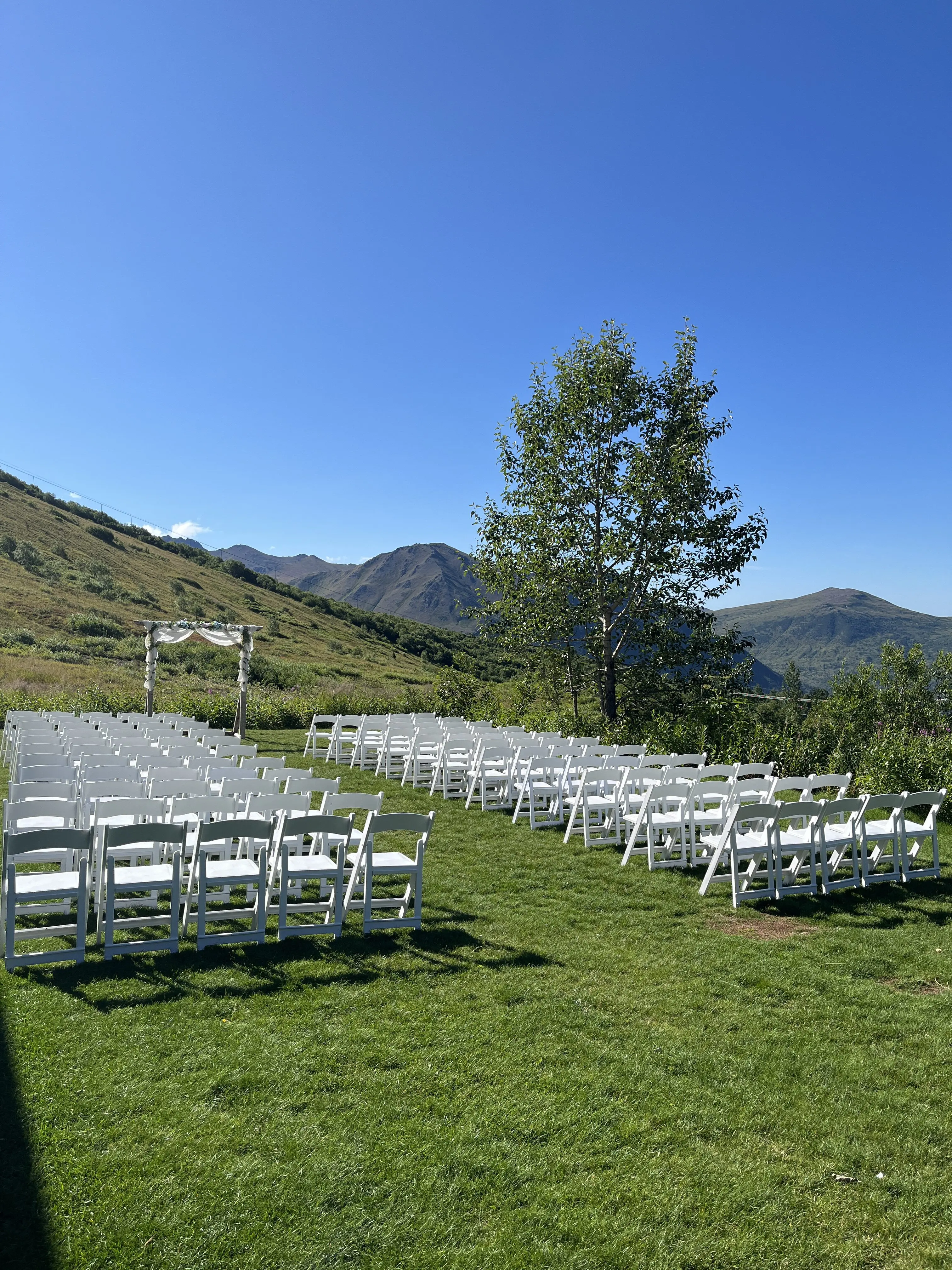 Our lodge is two stories and has many large windows allowing for incredible mountain views overlooking Anchorage. There is a large lawn in front of the lodge for outdoor ceremonies and, for those who are interested in additional views of the Chugach range, our chairlift is also available to rent.
